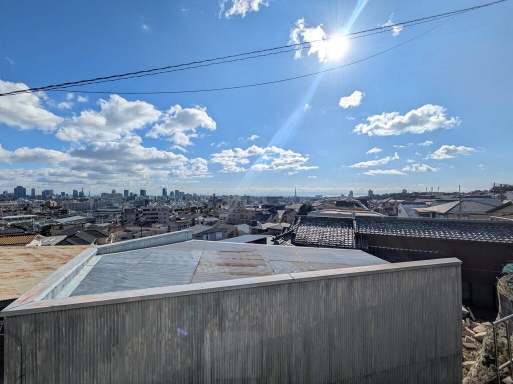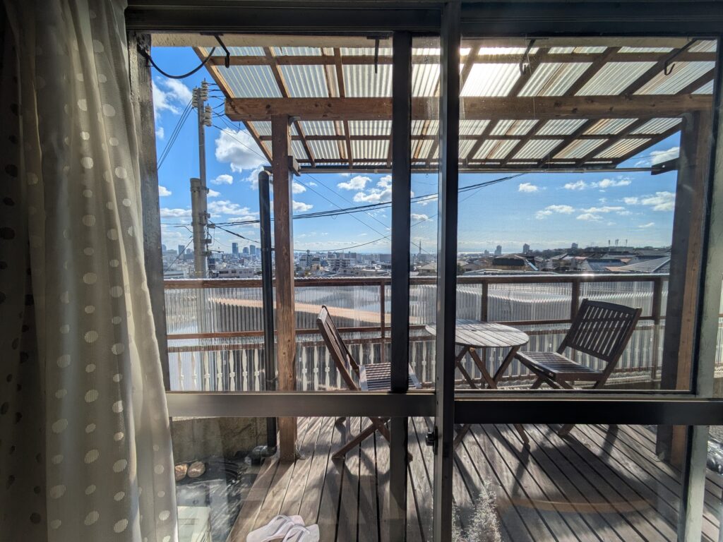 Shared spaces include a dining kitchen, a main living room for daily use, and a second Japanese-style living room with a calm atmosphere. A wooden deck overlooking the city extends the living space outdoors.