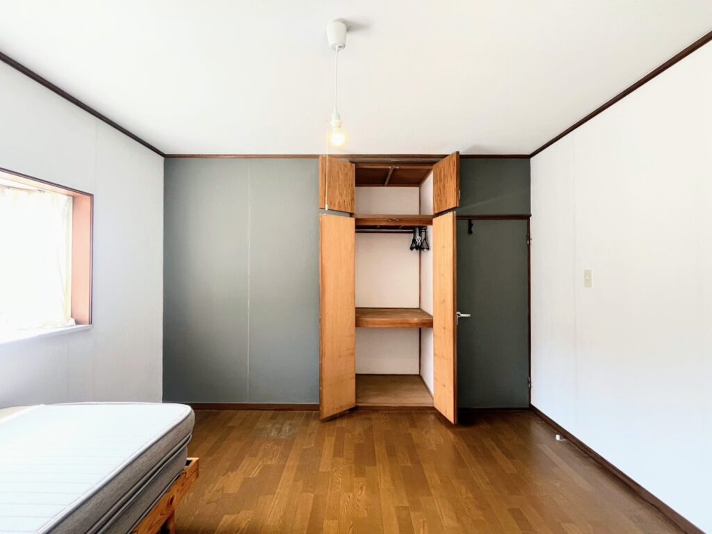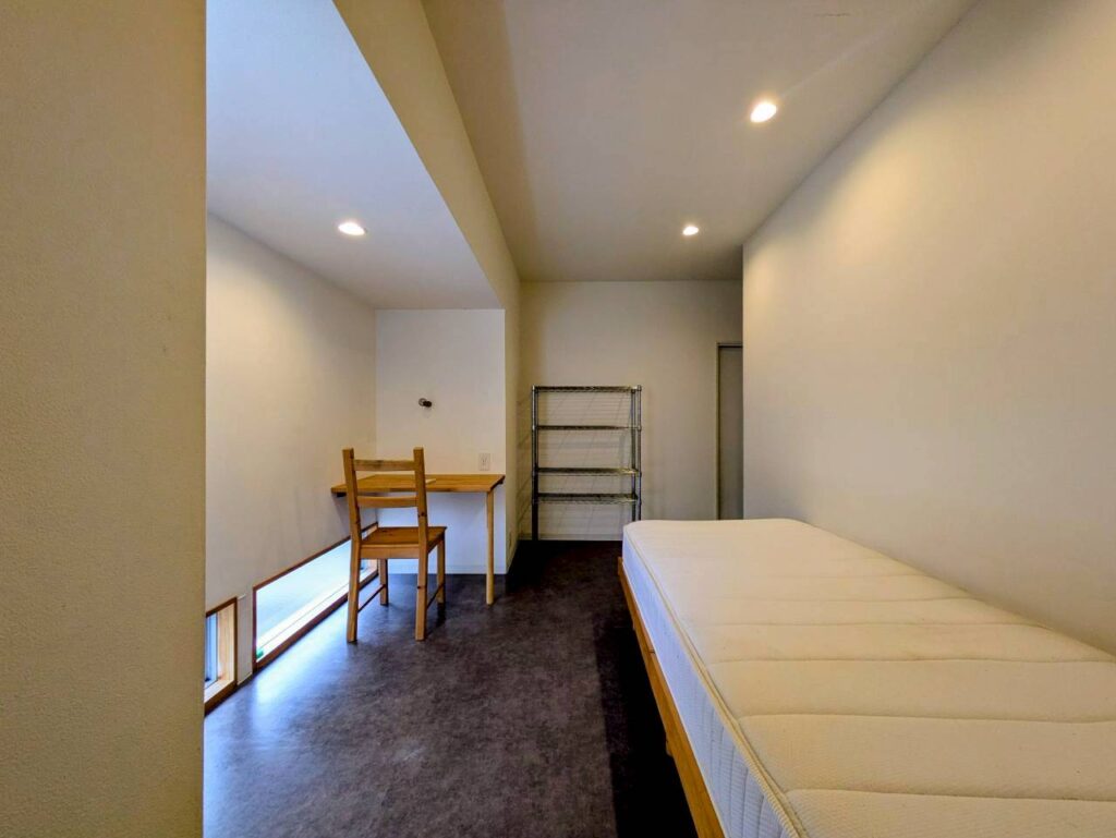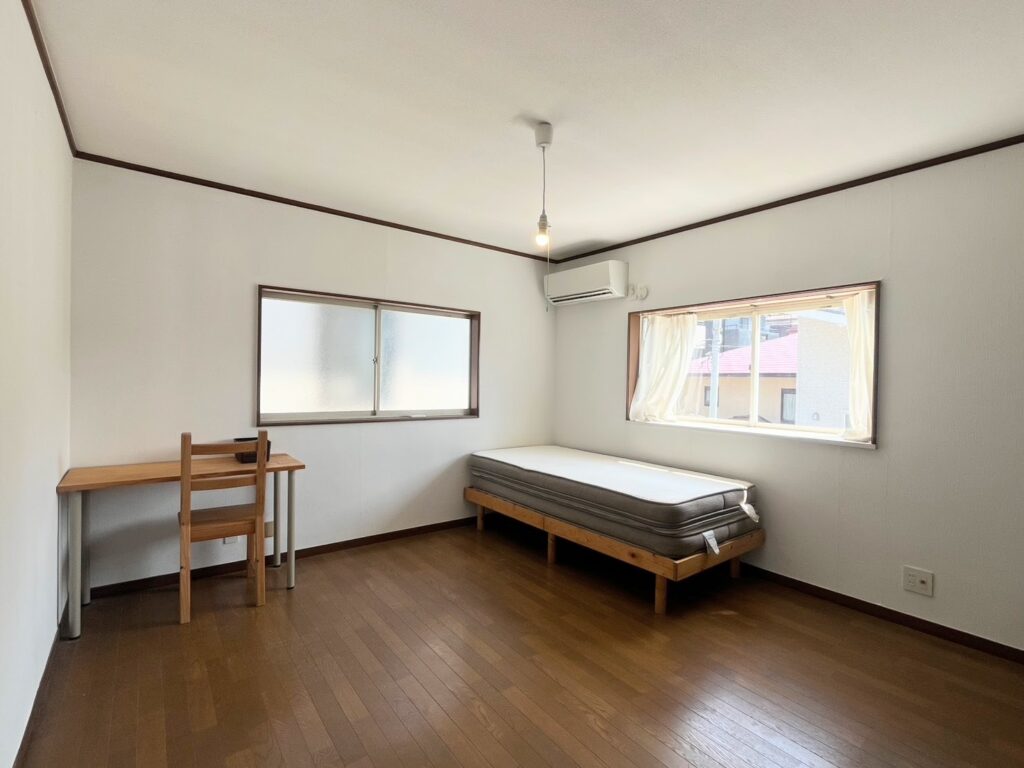 The house includes a system kitchen, two refrigerators, and a shared desk.Each private room is equipped with air conditioning, a bed, wooden desk, chair, and hanger rack.