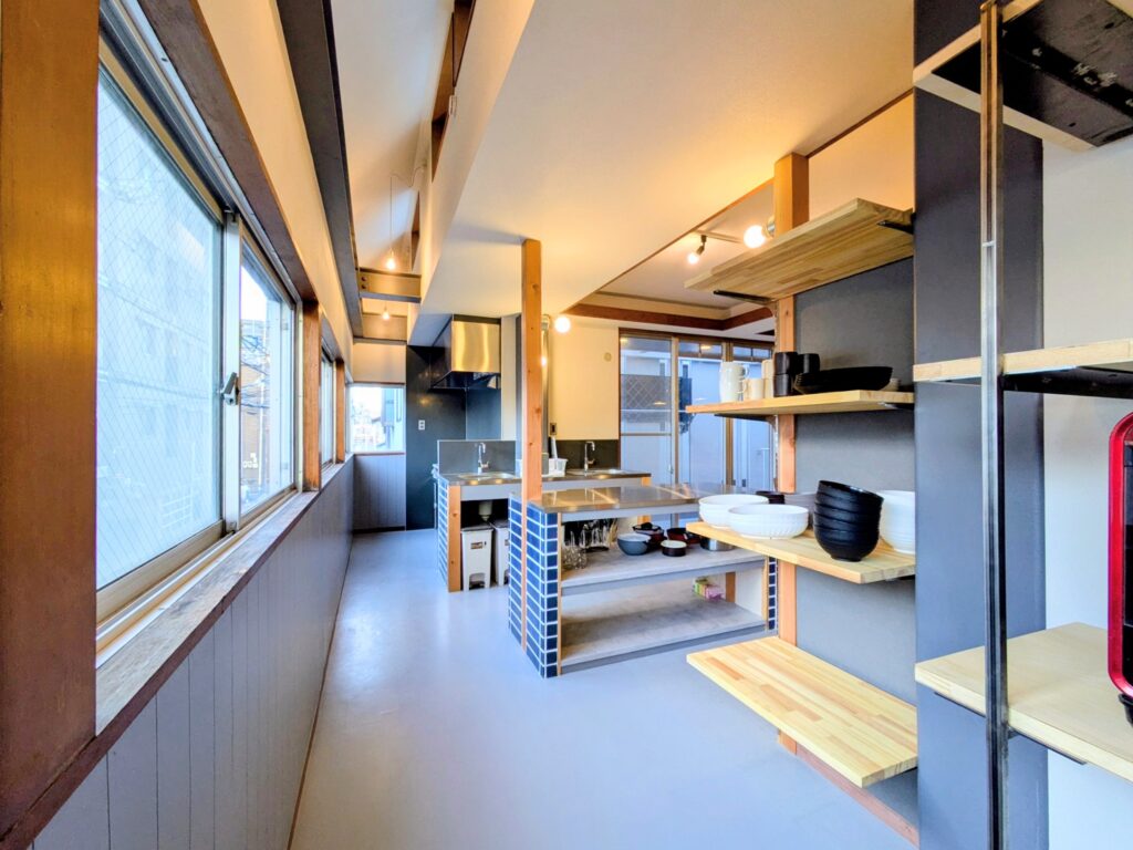 元々居宅として使われていたおしゃれな1戸建て住宅をシェアハウスに改装。リビングには、食事を楽しむテーブルに加え、座ってリラックスしながら交流できる「小上がり」を設置し、用途に応じて柔軟に利用可能です。デザインは近畿大学大学院で論文賞(修士)を受賞した一級建築士小谷勇太氏が担当。快適性と空間の広さを両立させ、地元産木の一枚板のテーブルを使うなど、あたたかみのあるデザインとしました。