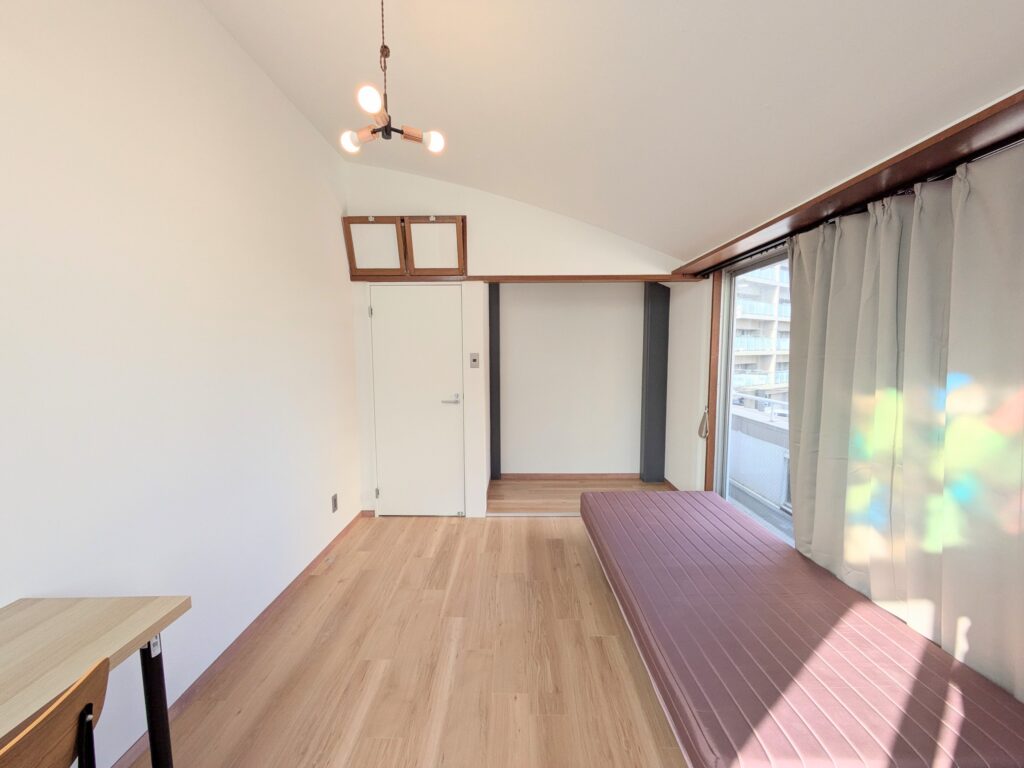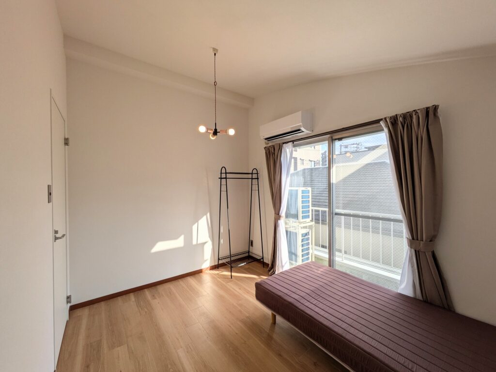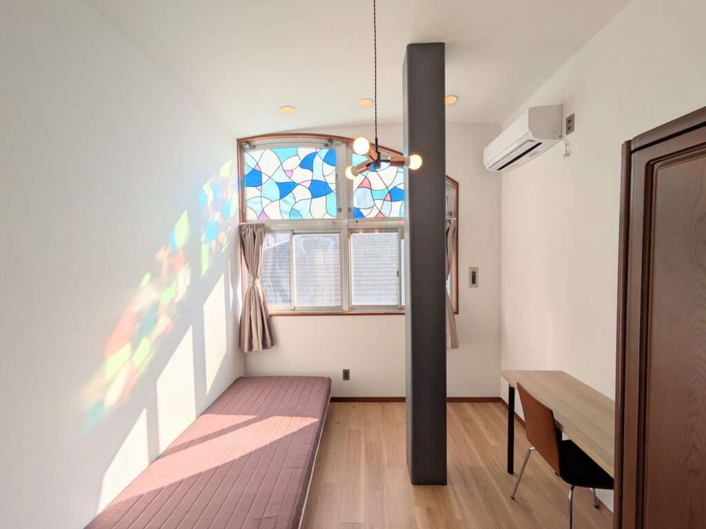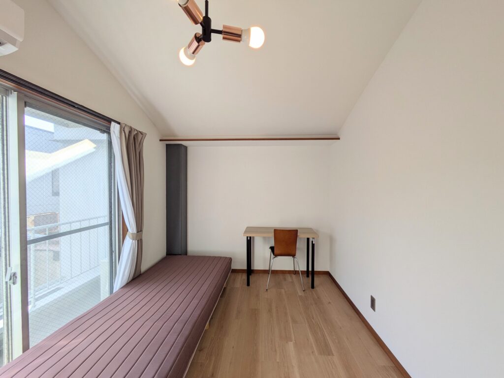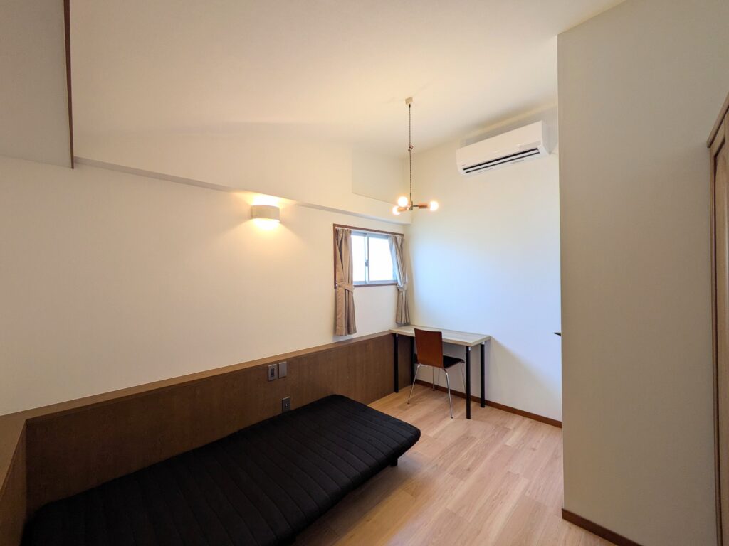 共用部には、洗濯機、乾燥機、冷蔵庫、調理家電、清掃用具などを用意し、布団をご持参いただくことで「ほぼ身一つ」で入居が可能です。入居期間は最短3か月としており、短期滞在の方にも利用しやすい環境を整えています。個室にはエアコン、ベッド、マットレス、デスク、椅子、カーテン、収納など、生活に必要な家具を揃えています。初期費用は事務手数料および初月の日割り家賃と共益費、翌月の家賃と共益費を合わせて、おおよそ10万円前後で入居可能です。